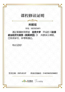 澳大利亚研究中心2023级国别与区域研究方向研究生熊醒握同学在学院内争取到为数不多的学习名额,并且顺利通过2024-2025学年上学期课程《国际组织与全球治理(精英项目)》与《全球政治经济大趋势(精英项目)修读》。
