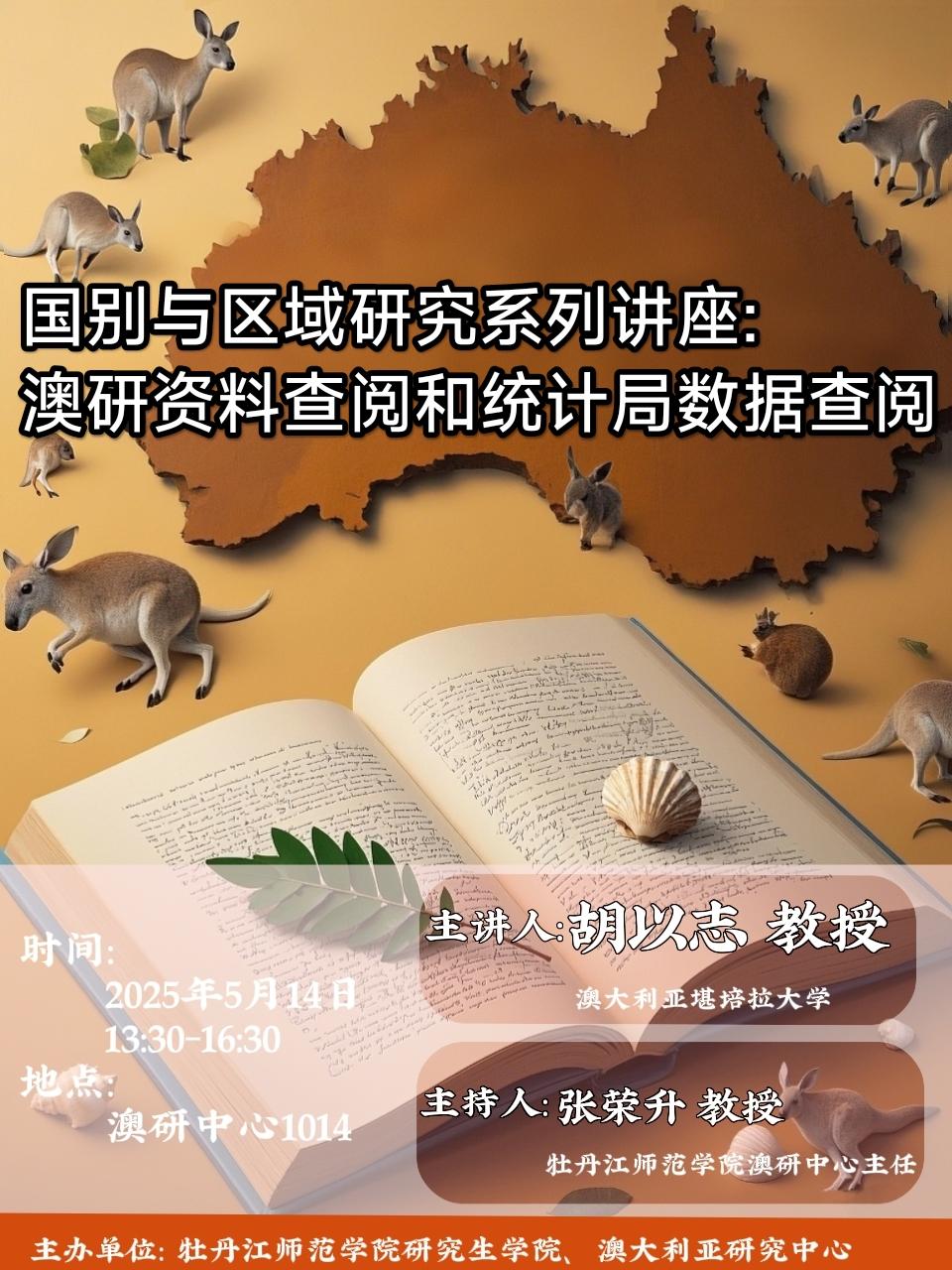 2025年5月14日下午,澳大利亚堪培拉大学胡以志教授为澳大利亚研究中心师生开展国别与区域研究系列讲座。胡以志教授以澳研资料查阅和统计局数据查阅为主题,为澳大利亚研究中心国别与区域方向研究生提供专业指导。中心主任张荣升教授、国别方向导师王霞、刘清明以及2023级及2024级国别与区域研究硕士生参加讲座。讲座伊始,张荣升主任对澳大利亚堪培拉大学胡以志教授的讲座再次表示感谢,并期望此次讲座能够对澳大利亚研究中心研究生论文写作提出建议和规范意见。
